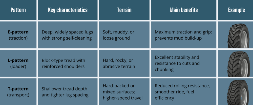 In practice, most site dumpers use E-pattern tires, as they provide the best combination of traction, self-cleaning, and durability on the soft or variable surfaces common to construction sites. Choosing the right tread ensures maximum traction, stability, and wear life for your specific jobsite conditions.